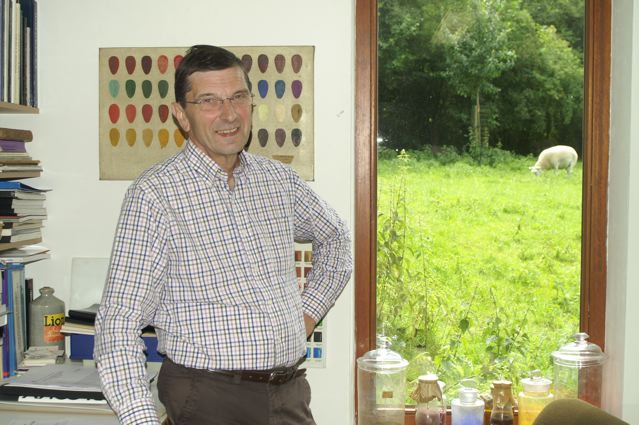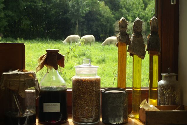 Mid July 2011, I leave the hard sun of Provence and just a few hours later arrive in Liege under a typically Belgian grey sky with big shots of light beaming at times on details of the scenery. This is the country of my childhood holidays and I love its gentle beauty. The area is (was most certainly) wealthy and comfortable. A House and Gardens elegant atmosphere emanates from the flowering fences and stone walls of the villas and impressive farm-castles that dot the countryside. The tempo is slow and summer heat is… low! Jacques, my host for the day, is delightfully in sync with his surroundings. And, although a chemist, I soon think of him more as a gentleman-colourman (as in gentleman-farmer). He proudly shows me his veggie patch and, while we talk in his lab, his sheep frame themselves in the window as in some Flemish landscape painting above the sill where strange shaped amber bottles – that are one of his family claim to fame – rest.