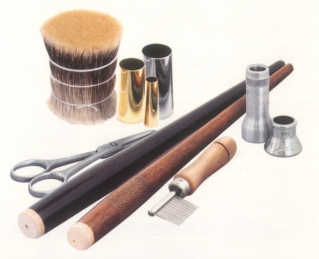 Pinching the right amount of hair for a number 5 brush is done by a clever graded carrousel machine. The hairs are then tied up and introduced into the ferrule manually and both go into a little mould, just the right size and shape for a number 5 round. Another shape will help make a bright or a cat’s tongue. Then tap tap tap to help the hairs slide down gently into place. The whole workshop swings to this soft tap tap. The hairs will go in and out of that shape a few times and extra hairs at the back of the ferrule will be chopped off since only the natural tip has the correct spring to be used. The remaining hairs are totally discarded -even in synthetic brushes. Again and again hairs will be measured, a few pulled out with tweezers to perfect shape, a rebel one eliminated… until the worker is satisfied. Quality takes time.