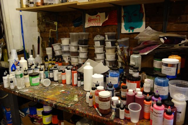 But then -before you begin to think this is a huge party in which only crazy mixed media artists have been invited and not a place for you- you might notice the opposite wall with shelves and shelves of rather dull white containers with very chemically obscure looking names like “Acrylic 50H”, “Urethane 32”, “Ammonia substitute” and the like on their labels…. Right, back to business. The very serious business of making professional quality paint.