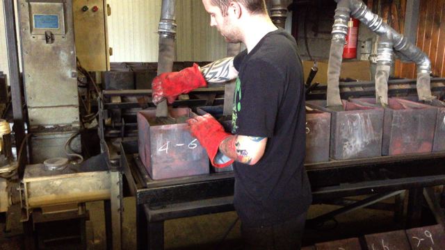 5) The reeds, cut into 6 inch rods, are then sorted again by diameter and placed into “cooking tins”. These will be filled with sand and vibrated to make them completely air tight so they do not catch fire during the ten hour burning process at 500 degrees Celsius.