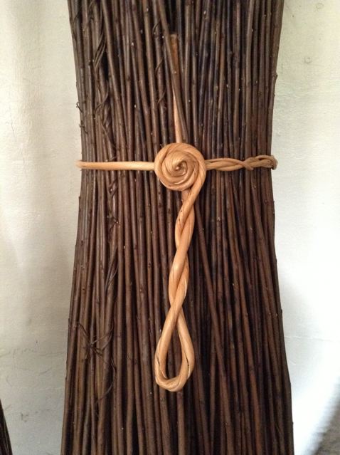 2) After that a willow stump will for the next thirty years need only one year to grow reeds ready to use. In the winter let the leaves fall and you won’t even need fertiliser! Come harvest time, in the early spring, cut the long reeds and assemble them in a bundle. Use one reed to tie them with a beautiful “rose knot”… The reeds are so flexible you only need to swirl one to get it into that shape (maybe twenty years of practice help too!)