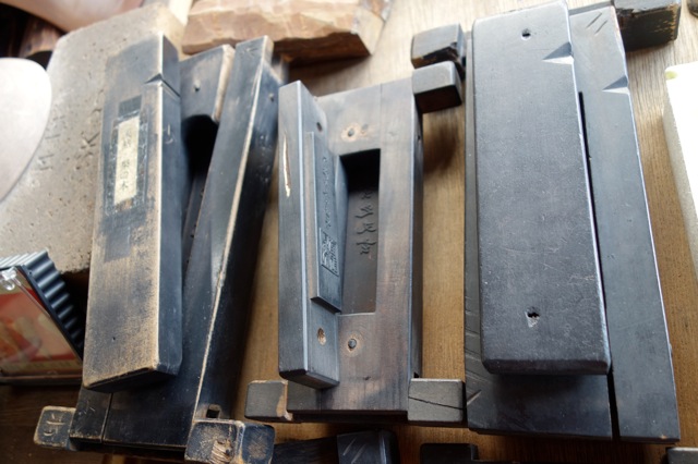 And so it is not without some trepidation that I pushed the door of the Kobaien Co. in Nara (Japan) two months ago. We chose that particular factory because it is the oldest one, fifteen generations of owners have prided themselves in making the finest sumi ink here, but an appointment I have not and no idea either if they will let us visit their premises. Of course, the shop is open to all and it’s already quite a treasure trove of ink sticks plus a few brushes and vermillion paste for the seals. But I want more! So we patiently wait until a lovely young man, apparently the English-speaking employee here, comes along. We try to explain our quest and… yes! He will translate for us while the more knowledgeable lady in charge tells us in Japanese the story of the firm and explains the steps of ink making.