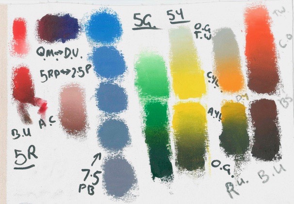 I asked the one artist that I knew used the Munsell system, Hobie Porter, to give us a talk and a little workshop one day and Oh Magic! Oh Colour Space Beauty! it all clicked into place. Not just for me, for all of us. SO, you pick paints whose pigments are not too distant in hue from Munsell’s primaries and secondaries… Hobie’s choice in oils was