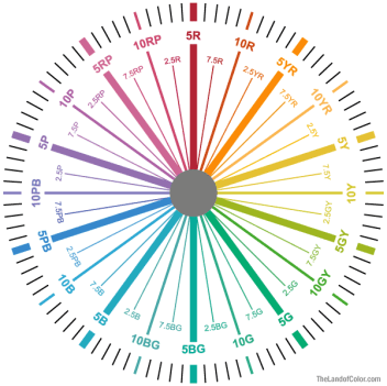 These hundred visual steps are the foundation of Munsell’s notation system and cover the first of the three colour characteristics he tackles: Hue. These steps were, as far as humanly possible judged equal by himself and his team and, reviewed later on with the help of more precise machines, were found to have been pretty accurate in fact… ha the good old eye! Munsell, being Munsell however, he did not give all hundred of them cute little names: “Can we imagine musical tones called lark, canary, cockatoo, crow, cat, dog, or mouse because they bear some distant resemblance to the cries of those animals?” No, no, no is the answer. Munsell’s notation will be modern and pragmatic. His ten major hues will occupy clockwise a circle in which all ten ‘pure’ colours will sit at 5. Increments of five steps have brought all of them to their full hue and another five will take them towards the next tertiary. For example, pure Yellow in 5Y will carry its course either towards Yellow-Red Yellowish in five steps or towards Green-Yellow Yellowish in five steps where, in both cases, it will get another name.