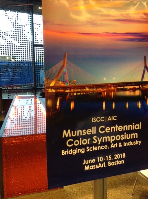 Earlier this year, as I landed in Boston a bit excited and somewhat fretful too, I knew my indifference to and ignorance of Alfred would de facto come to an end as I had signed up for a five day long Munsell Centennial Colour symposium. I could have researched him beforehand but had decided that if five entire days would not give me a better understanding of that one, I should probably best give up colour research altogether! The symposium was offered by the Inter-Society Color Council and L’Association Internationale de la Couleur –originally a French organisation, now international. I had asked to join, had been accepted as a member on presentation of my threadbare experience, but expected to easily make myself small by dissolving in a sea of thousands of colour enthusiasts. Well, the totality of this very successful year’s gathering was more in the region of 200 participants –which was fabulous as we got to talk to virtually everyone over the course of the five days– and virtually everyone was a specialist in some aspects of colour. At a glance that first evening I got the feeling that, unlike myself, for some if not most gathered in the large atrium of MassArt, the Massachusetts College of Art and Design, having fun during five days was not uppermost on their mind. Academics or not, they had crossed the world (27 countries represented) to give serious presentations and talks in which their reputation was at stake and their point of view would be weighed, debated, perhaps even dismissed. They also seemed to know or know of most of the other colour geeks gathered there. I scanned the programme I had just been given: “Reflectance Reconstruction using a Multi-illuminant based Multispectral Imaging System”, “Practical application of Browns and Greys based on a Vector Concept”, “Color Processing in Artists and Non-Artists Participants in Relation to Individually Determined Photopigment Opsin Genotypes”… I grabbed a glass of wine… Lord, what was I doing here?