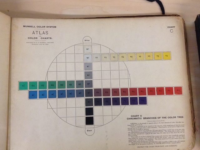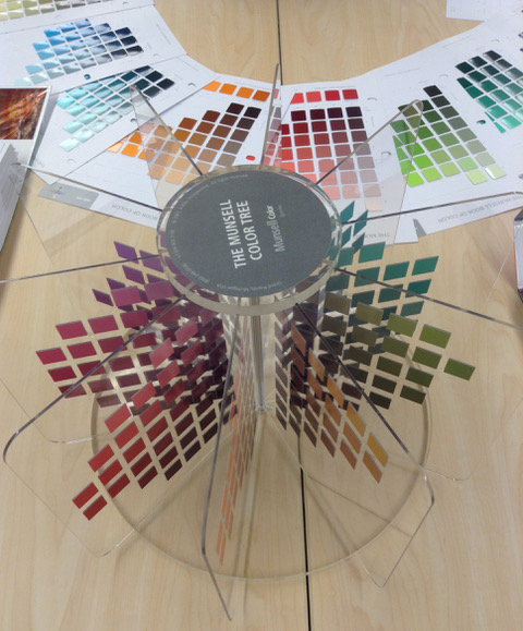 The Munsell colour chips books are still being used and if not hand painted anymore, are lavishly produced by Xrite, who do the Pantone ones too. Among them are a few declensions you might not expect, such as a whole one about Foliage or Skin tones or Soil hues (archaeologists use it a lot!) The skin one was missing in Boston and when I asked about it, the Xrite rep answered: “Just look at the soil one, they’re pretty much the same. Then he added poetically, “Dust to dust… you know!”
