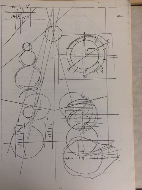 From prize student, Albert turned teacher in the same establishment and it was there that his passion for teaching colour to his students and children in general, made him develop both a concept for understanding colour and a system to communicate it with precision. A sound approach seemed to have been his aim but quite a playful one too. In 1899 he filed a patent for a colour globe on which the colours of his rainbow were at their strongest at an imaginary line equidistant from its poles, dividing it into a progressively lighter northern and progressively darker southern hemisphere. This one is the first of his 3D representations. (I do not know if above were preparatory drawings but I found them bound with the typed version of his journal that, among other wonderful treasures the MassArt library has in its archives, we were given to see and the liberty to handle.)