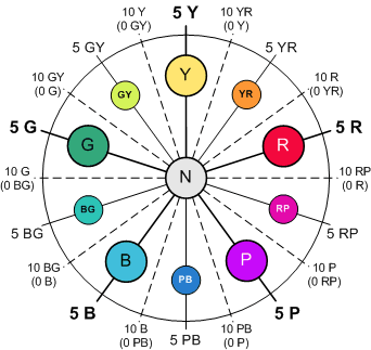 In-between each of these the tertiaries which he names the ten Second Intermediate hues. YR-Y: Yellow-Red yellowish, R-YR: Reddish Yellow-Red, etc. Finally, in order to further refine this, he creates eighty Special Intermediate Hues, numbered from 1 to 10, like so.