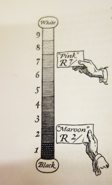 Black via a scale of achromatic neutral greys slowly turns into white and the whole concept is pretty easy going if only applied to these two colours –by the way, neither 0 nor 10 are ever represented in the charts or the chips as they would endlessly be white or black. Where it gets more interesting is that all colours have a value too of course. It is –quite– easily found with a perforated value scale and, if you have an interest, do yourself a favour and buy one of these. They do reduce the guesswork to a minimum.