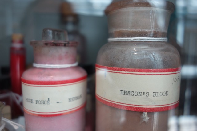 In a strange sort of way, maybe intended, these eclectic displays reflect the messy, random way we obsessively searched for colours and the ingredients they could combine with to make our lovely paints and other materials we can use to make Art. They most certainly draw their very own map of the world: berries from Persia, cowhide glue from Kyoto, plaster lime from Florence and Meudon white, wood cuttings from Brazil, pink earth from Constantinople, a ball of raw Indian yellow, lapis from Lazuli, copal from Zanzibar and madder root grown in… E.W. Forbes’s garden!
