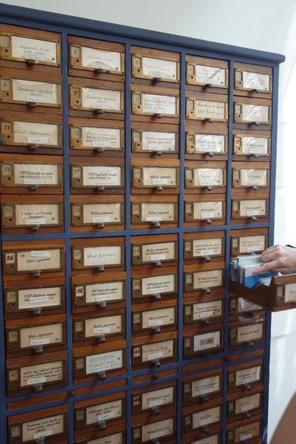 One would assume the pigments to reside in a vault underground or at least in the lower ‘historical’ section of the building but not at all. There they are at the top, aligned in lab-like glass cabinets along a narrow corridor paneled with glass too so that you can see it (the collection) from the courtyard even if you can’t see them (the pigments). I presume the glass has UV protection, or they’ll know soon enough if some of these treasures are not lightfast! When you reach the fourth floor and finally enter Ali Baba’s colour stash, with the sun shining through the ceiling, hitting the beams and scattered by all this glass, it is breathtaking –if virtually impossible to take a good picture in there! (If you ever needed such a thing, acquire An Atlas of Rare and Familiar Colour in which most prominent pigments are represented in a very pared-down sleek setting but exactly as they are preserved in the collection.)