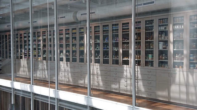 What I was not prepared for in the least however was that random, mumble jumble of old measuring devices, pig’s bladders, tubes, bottles, phials, boxes, shakers, trays, Petri dishes on the shelves behind these scientific looking doors. Furthermore, every little or large bottle has a different shape, colour, original label and cap: twist, seal, plug, cork, glass. Some look so rusted that you have to wonder if they have ever been opened. But yes is the answer as every item is strung now with a neat little label complete with barcode and all the pigments –their characteristics, spectra, etc.– are in a database accessible to professionals, often restorers, in need of such information. If in the mood, you can check it yourself here.