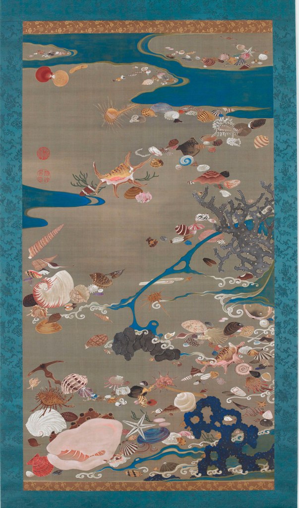 You can play with your support… leaving some areas unprimed for that particular effect, for example. Or you can also apply the quite recently available transparent gesso and leave some of the linen’s lovely colour apparent. You can even paint on totally un-primed textiles, too, of course. You’ll simply lose most of your paint, which will sink in the fabric… a technique that was perfected in Japan around the 9th century on silk. Silk has a unique transparency, and so artists have played with painting both sides of the cloth. When it is woven hiraori style— a crisscross armature of warp yarn and weft thread — hues applied to the reverse of the fabric and seen through it will be soft and delicate while those on the front will be enhanced. It also brings an eerie depth to the work. Jakuchū (1716-1800) was a master of this urazaishiki, “reverse colouration” technique, and all his works in The Colourful Kingdom of Living Beings, in which he used both pigments and dyes for different effects in the cloth—solid, layered and textured pigmented areas juxtaposing subtly diffused dyed ones—are among the most exquisite ones Japan has ever produced. Jakuchū even understood that adding a deep grey barrier of bamboo paper at the back of the silk would bring out even more contrast to his colours… talk of interesting layers of ‘background’ painting!