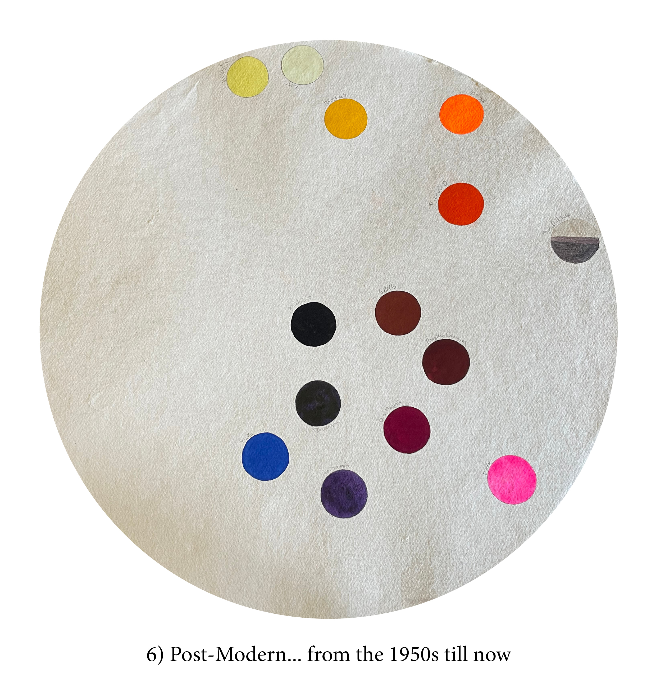 I feel this Post-Modern section cannot be ended without a word about Post-Industrial pigments if you will call them thus. There is a trend among many artists today to veer away from all ‘unnatural’ pigments, just as there is a weariness around solvents or even fossil-fuel-based binders paints, and, frankly, I get it. However, it’s hard to get high chroma paint out of pigments collected from the side of the road. And, if you only use these, you might also be missing substantial colour spaces or even the flexibility of an acrylic binder. But nothing and no one has been harmed in making your paint, and the loss of some ‘qualities’ might be the gain of a more sustainable art practice plus your peace of mind, so I can only applaud. Yet, although the practice might possibly be coined post-industrial, the pigments are quite the same as they ever were, beautiful Earth pigments or lakes from flowers and barks, and I don’t know that these deserve a new appellation.