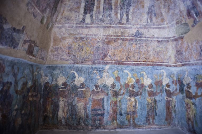 It’s easy, really. Once you know how. And yet some dark magic (perhaps not compulsory if you want to try the above recipe) might still have been needed, as it seems copal incense played a part in the mix while the pigment was made during sacrificial rituals in which men were then covered with this blue and thrown into a sacred well to appeases the provider of corn, aka the rain god Chaak. When that Cenote Sagrado well was dredged some years ago, along with bells, rings, masks and many human bones, a five-metre layer of blue pigment was found at the bottom of it… told you pigment was insoluble, didn’t I?