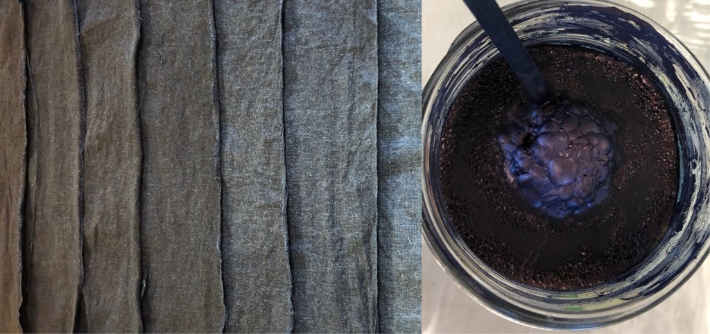Still confused, I was. But that’s because indigo is a rare one, a babe that, indeed, cannot be dissolved into oils, resins or water, so it’s correctly labelled a pigment. Yet, when some magical ingredients are added to a vat of indigo (there are quite a few recipes), it does not entirely dissolve but releases an amber or yellowish-green colour, which will impregnate your wares. Sometime later (again, depending on the methods), when what was soaking in the pot hits the air, an oxidation process happens, and mere seconds will turn it under your eyes into one of the most divine blue possible… further dips, will ensure endless variations of the blues.