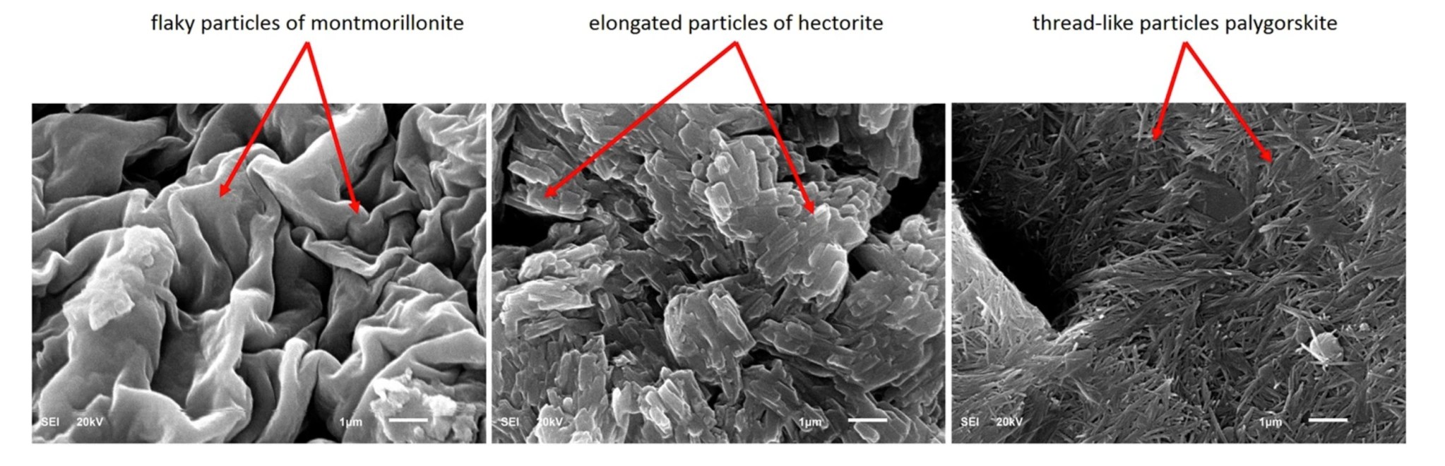 Scanned electron microscopy (SEM) of three types of clays taken from different websites.