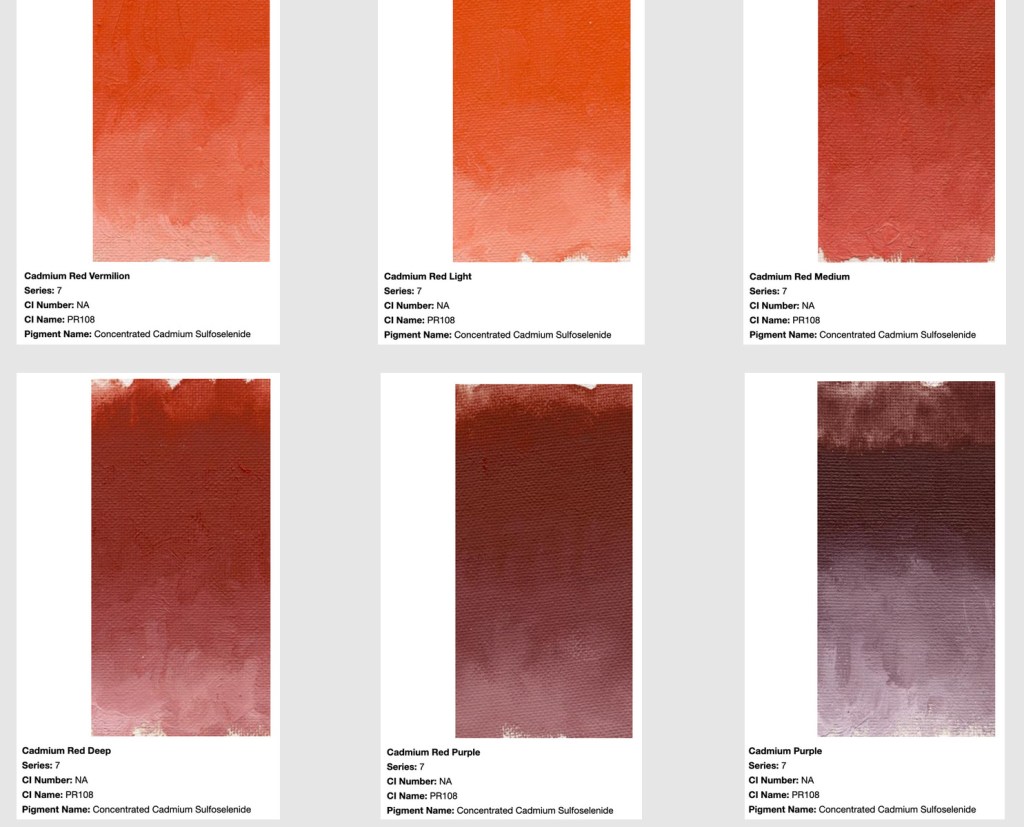 Secondly, that system is not a colour notation system at all. If it was, it could give artists some certainty about getting a specific hue, but that’s not what that code is about. C.I. ‘names’ only reference and describe the chemical constituents of a pigment. So take our PR108 seen above. Even if you ensured it was a genuine Cadmium Red, correctly labelled PR108, you would find dozens of red options under that heading. Each with of different shade, from lighter to darker, from cooler to warmer… and yet all under the PR108 code! (Which explains the variations in hue you might have noticed from company to company as each has picked the one they liked best.) One could now rephrase or paraphrase Alberts, thus: “If one sees “PR108” (the chemical name of a pigment) and there are fifty people making paint, it can be expected that there will be fifty reds in their minds. And one can be sure that all these reds will be very different!”
