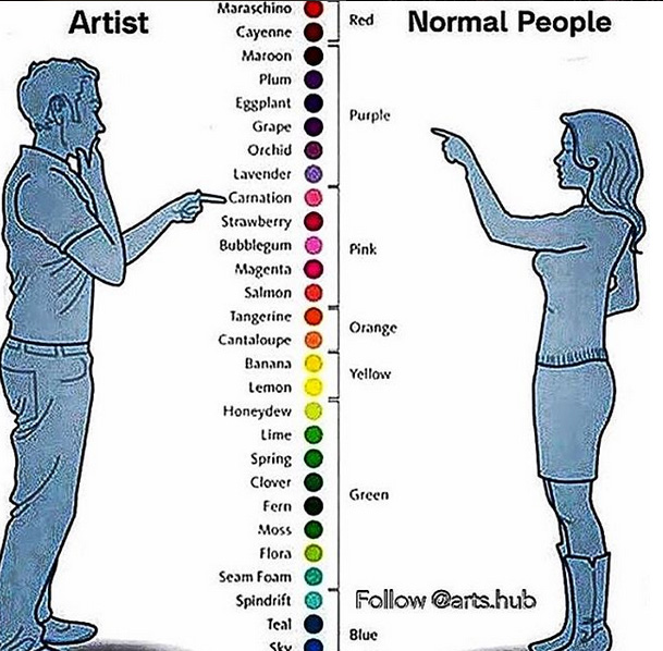 Still, we need to describe colour obviously in that world too. So how do we go about it? When I came across the above image on the net, it amused me because whoever that guy on the left is—and I could have an educated guess: Dulux product & sales manager, maybe? Interior decorator? Instagram poet?—he is no fine art painter! These wrestle with colour all day long, of course. It’s their despair and delight, in short, their medium, their language if you will, but while creating, they’re talking to themselves, so they don’t need to name what they see. When the need happens, they don’t reach for the above tutti frutti salad of bananas, limes and tangerines… meaningless colour references for many European masters who, on top of it, most probably never even encountered a banana in their lifetime!