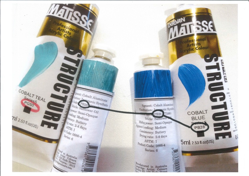 Also, as a matter of choice, some paint companies use, for example, variations of the blue pigment PB28 both in their Cobalt Blue and their Cobalt Teal—picking chemically similar cobalt aluminates with different hues. Yet, in another brand, you’ll see the tube of teal mentioning a different pigment, usually a green one named PG50, so that even when you’re chasing a pigment and not a hue, the whole thing can be somewhat disconcerting.