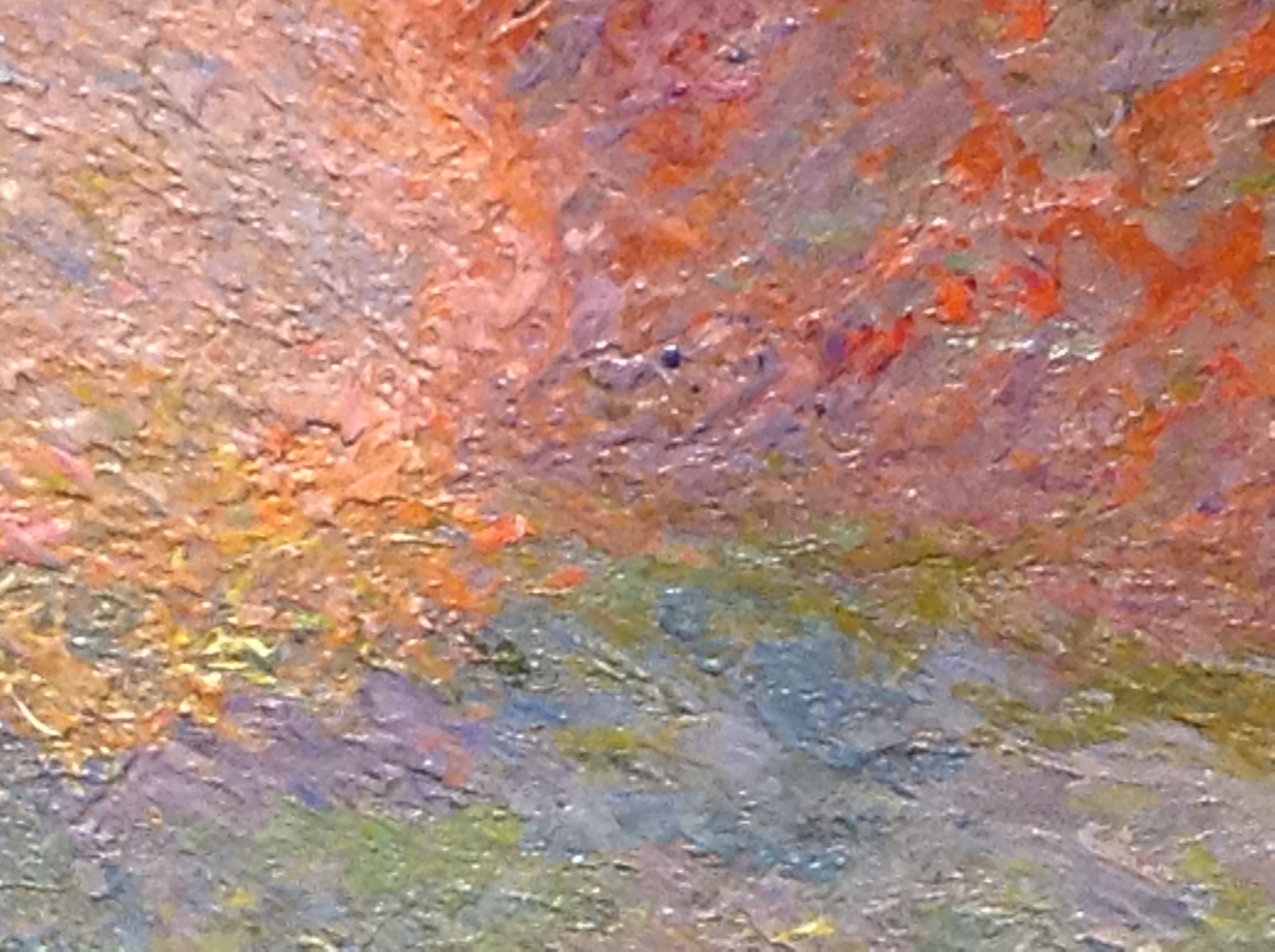 Seen up real close, as I was often allowed to when I helped my mother with large works, it is quite fascinating what a world can live in just a few centimetres… infinitesimal colour variations that make the painting sing in tonalities so much more exciting than the overlapping of Cyan Magenta Yellow and blacK pixels, I can tell you!