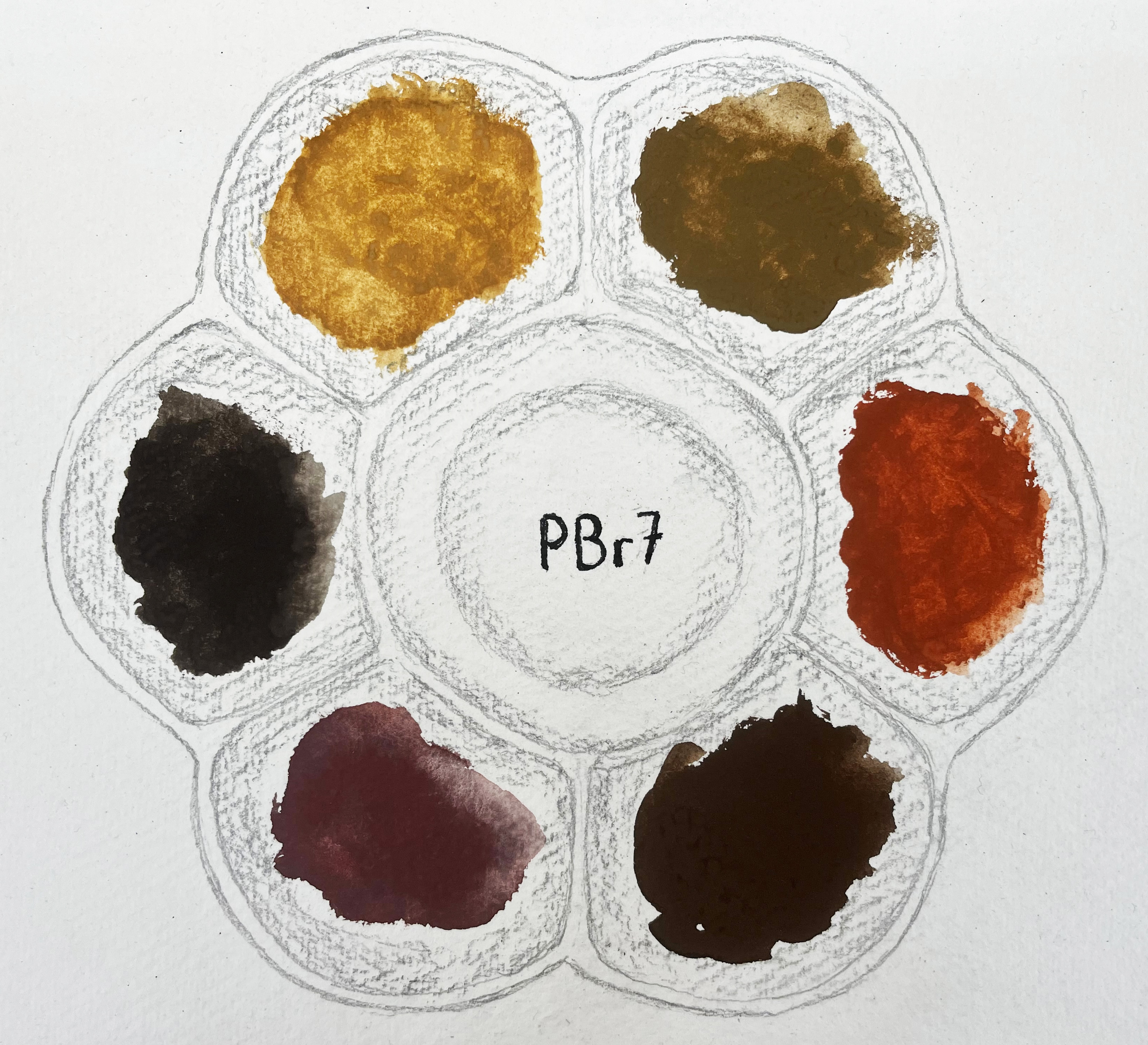 I first came across those differences in the Earth pigments which, with chemistries essentially similar, offer wild colour variations resulting mainly from their origin and different degrees of calcination. Other things can also impact, such as particle size and shape, as we shall soon see, while minor differences of trace elements, metals or other compounds in the iron oxides’ composition can play a part but not enough to give them another C.I. Name. To illustrate my point I’ve represented a few below, all watercolours from the extensive Daniel Smith range.