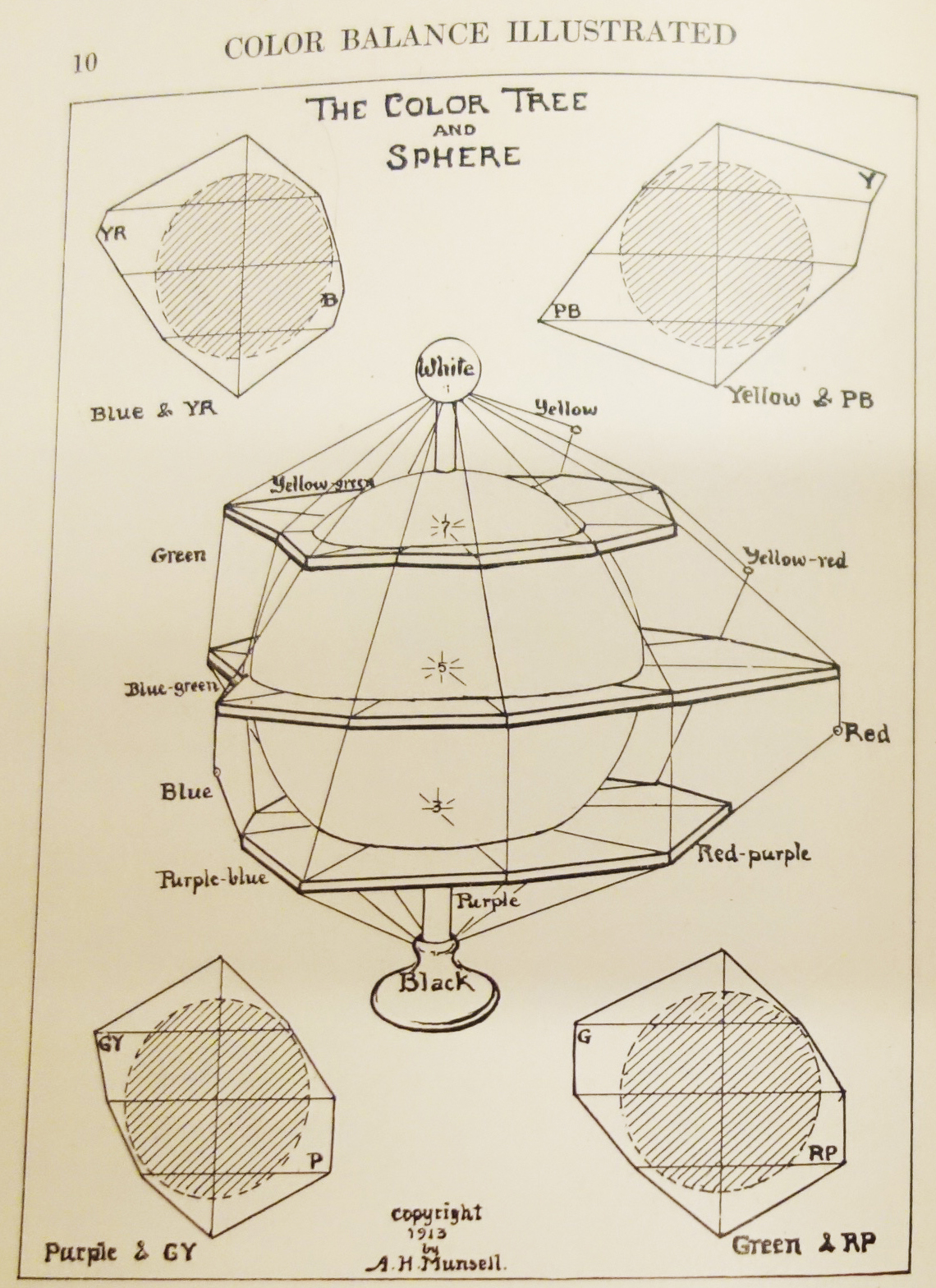 Yet, to go back to our confused beginner who might have just bought the colour wheel on his list, we’ll have to warn him that things might be going the other way! Most printed colour wheels on the market today go round “anti-colour-clockwise.” A personal opinion that, but for me stacking paint tubes on racks all week long, one that became a genuinely annoying detail. So yellow’s at the top of them wheels, but then, surely, we should proceed clockwise to orange and not to green unless, perhaps, we’re Japanese! Also, so many colours are missing on the wheels: the browns, pinks, black, white and it’s, of course, because these lack a dimension. In a 3D colour space, things are a bit more coherent and realistic… but go explain to a beginner that he’s looking at a map of the world, not a globe! And not even a very round globe at that, as maximum chroma differs for the different hues, making all these bits stick out, as Munsell quite rightly understood. Quite a different vision, you must agree…