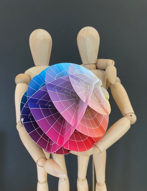 During my meanderings in the art materials world, I came across Richard Frumness, the charming entrepreneur-artist behind the R&F oils sticks and encaustic company. For Richard, the colour wheel should be… squarish and friendly! For one, he thinks linear stripes on racks are not the go as they do not help artists. When colours are displayed in a grid format, with greens not too far from the teals and close to the blues, it only makes more sense. It’s more about kinship than formality… This is how their ranges and charts are set up—even their delightfully messy help-yourself pigeon-holes in the workshop space of their factory (Is messy even the right word, I now wonder? Maybe intuitive or organic are better ones.) In front of it, Richard shakes his head: “I don’t know how this got to be so crazy, but it’s terribly crazy”, and that seems to sum up the whole colour adventure for him!