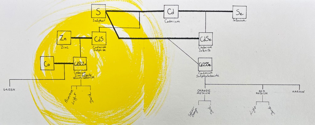 As promised, now is the time to dive into the pigments we play with on our palettes that get their hues from their chemical composition. The Cadmium family is a most interesting, if confounding, example of this. Establishing the family tree of the primo-genitor, Cadmium Yellow, was quite epic, I can tell you, and it revealed to me how much more complex things are, in actual fact, than what I had understood previously. Sulphur seems to have married both Cadmium and his daughter-in-law Cadmium Selenite. From his first marriage was born Cadmium Sulphide, who married Zinc, and their union gave us Yellow Medium and, eventually, Yellow Primrose, Light and Dark too. (The union of Cadmium Zinc Sulphide to Cobalt Blue also gave us Cadmium Green, but that’s just a yellow/blue mix, so it doesn’t count, really). On the other hand, Cadmium Selenite (the daughter of Cadmium’s union to Selenium), after meeting Sulphur, produced a charming little compound, Cadmium SulphoSelenite, who defiantly needed no partner whatsoever to produce Orange, Red and Maroon in all their variable hues (all that is required is to replace the sulphur in the lattice with increasing amounts of selenium, a totally transparent stuff which broadens the spectrum which the pigment can absorb.) Gosh!