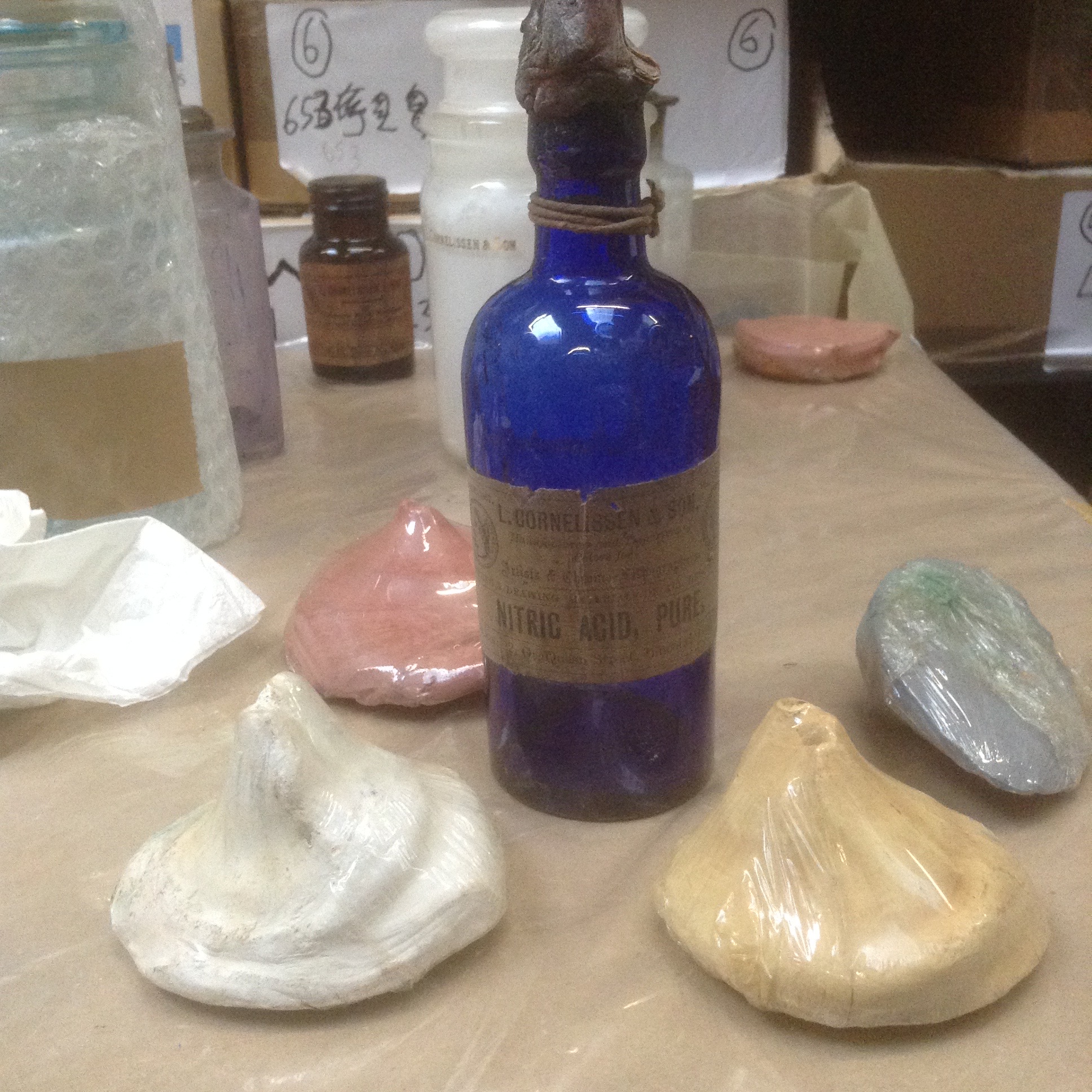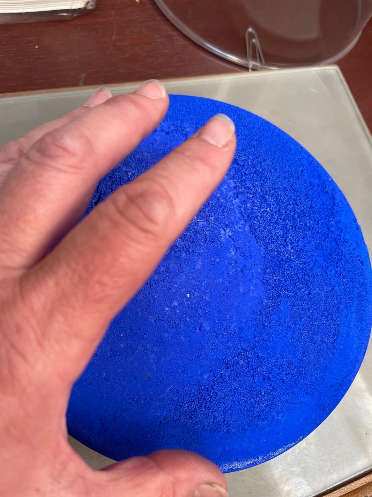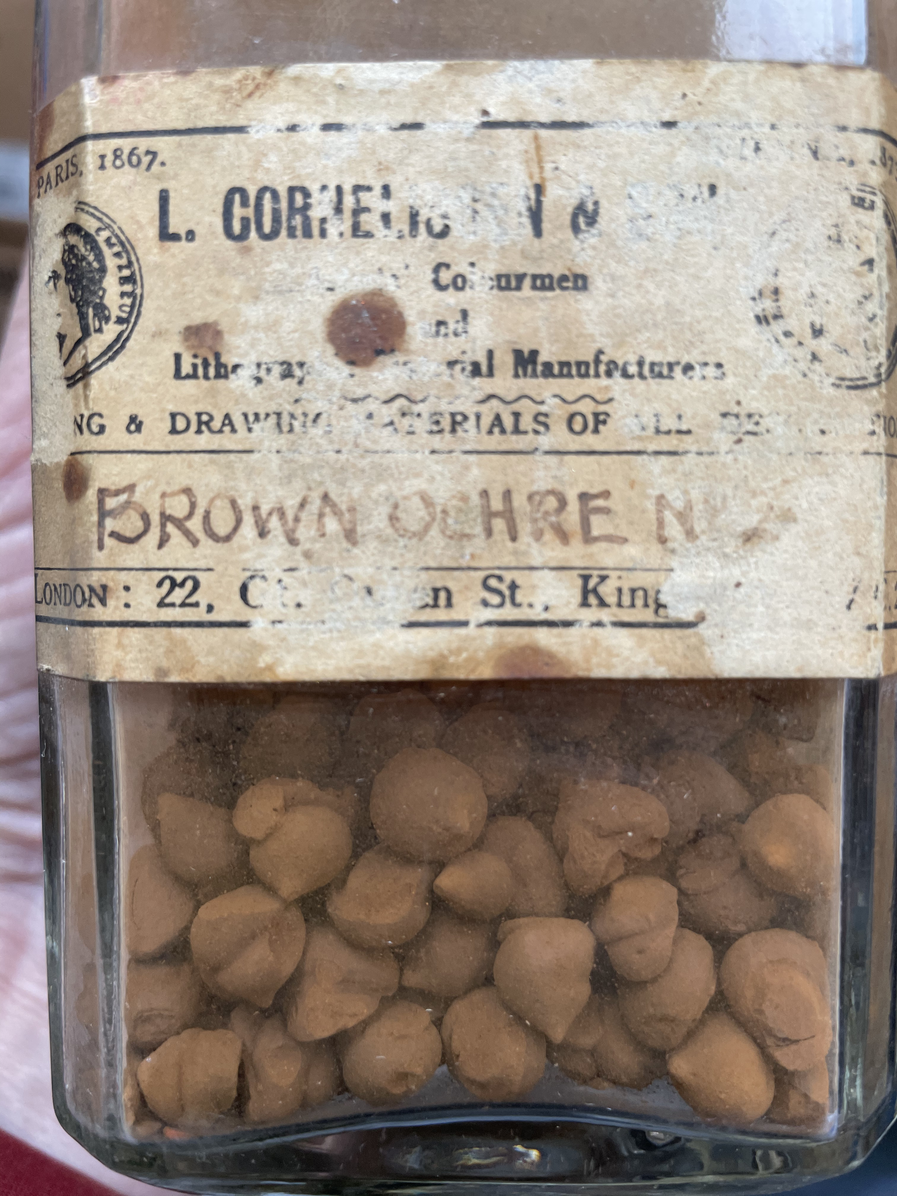In the Cornelissen archives, I found a large jar filled with marble-sized pellets of Brown Ochre one day and wondered about this presentation. Then, a few weeks later, I stumbled upon much larger ones individually wrapped and had to ask what these were. The charming Lucy then took me by the hand to check out one of their treasures in Nicholas Walt’s office (he’s the present owner.) There, under a globe, sat a mesmerising blue ‘cake’ slightly smaller than my hand but a good finger in height of pure Cobalt Blue. They haven’t a clue how that one came to be… surely no artist would ever need that much! But it seems that colourmen often turned pigments into cakes, solid forms they would sell by weight, probably to save time, but also handling the volatile material. To do so, they would compress the dry pigments, sometimes add a little alcohol, or, in the case of laked pigments, some of the residual water, and the wetted pigment could then be extruded into teardrop shapes or left to dry in moulds. The idea was a good one, but I supposed there must have been some price chart by weight because some pigments are heavy as nightmares and some light as dreams…