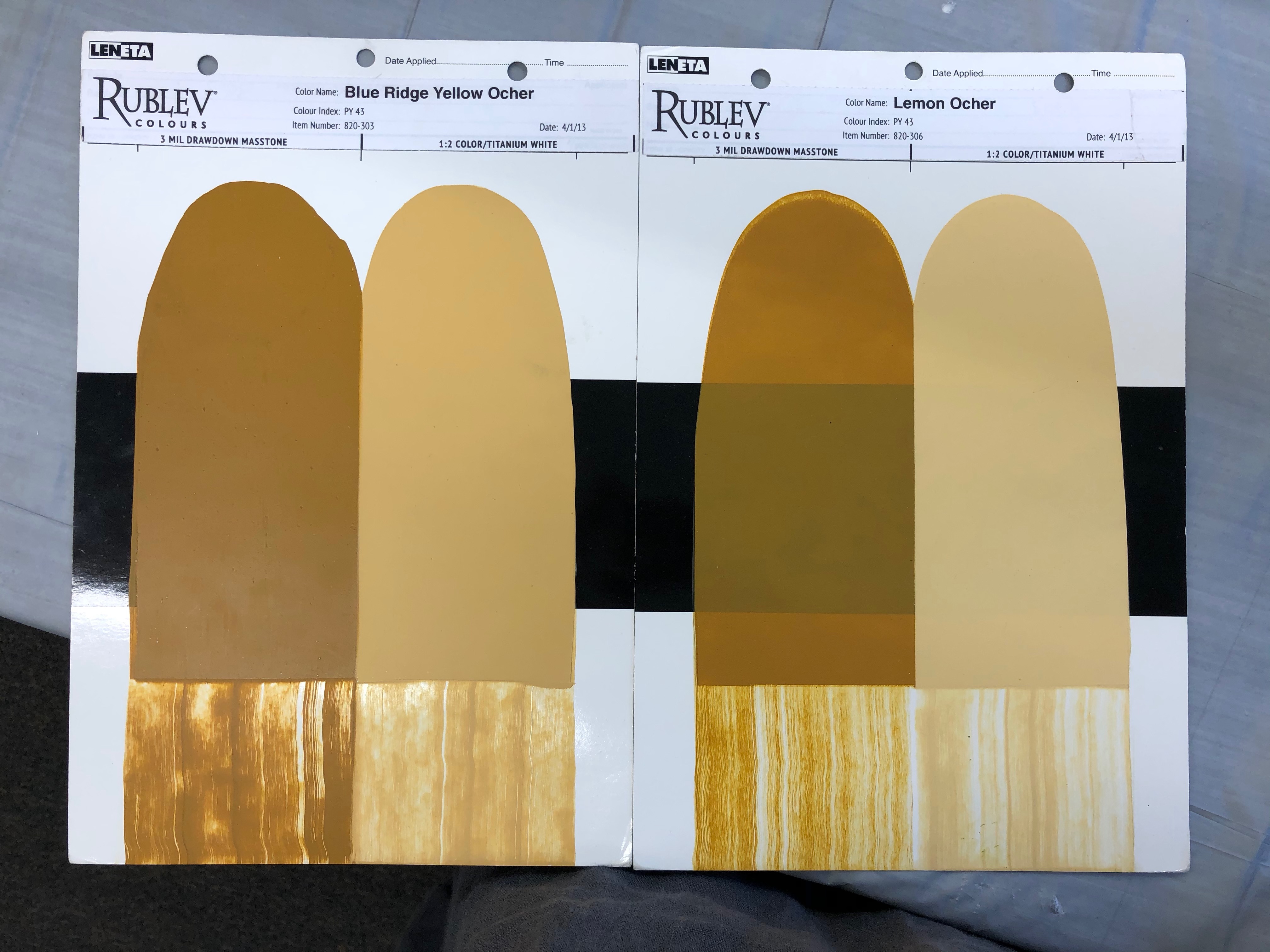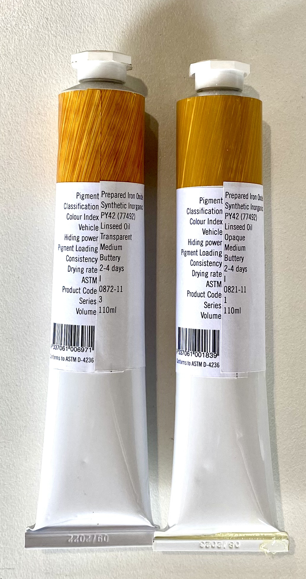 This characteristic of pigment has mostly to do with its ability to scatter light, while this, in turn, is determined chiefly by the size of its particle size (and the paint binder’s ability to scatter light as well, but we will get to that later.) As particles become finer, they scatter light more effectively, and this bounce-back effect makes it more difficult for our eyes to see the background they are coating—hence an accrued opacity. But then comes a point of diminishing return, and opacity decreases. This counter-performance, if you will, is something paintmakers play with, as it allows them to produce from the same pigment, PY42, for example, both a Yellow Oxide paint, side by side with a Transparent Yellow Oxide. (This is not to say that two different pigments with the same chemical composition, in this case two natural Yellow Iron Oxide, both PY43, cannot have different opacities; they can, and they do.)