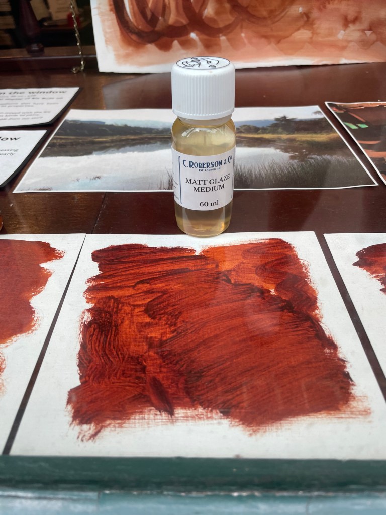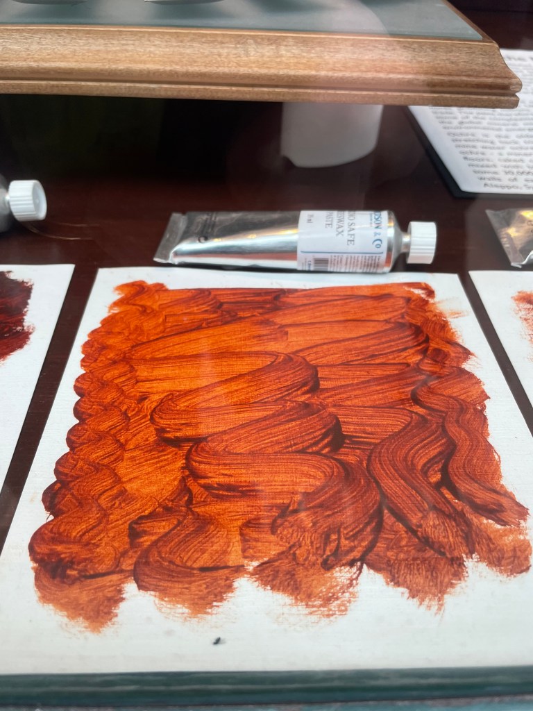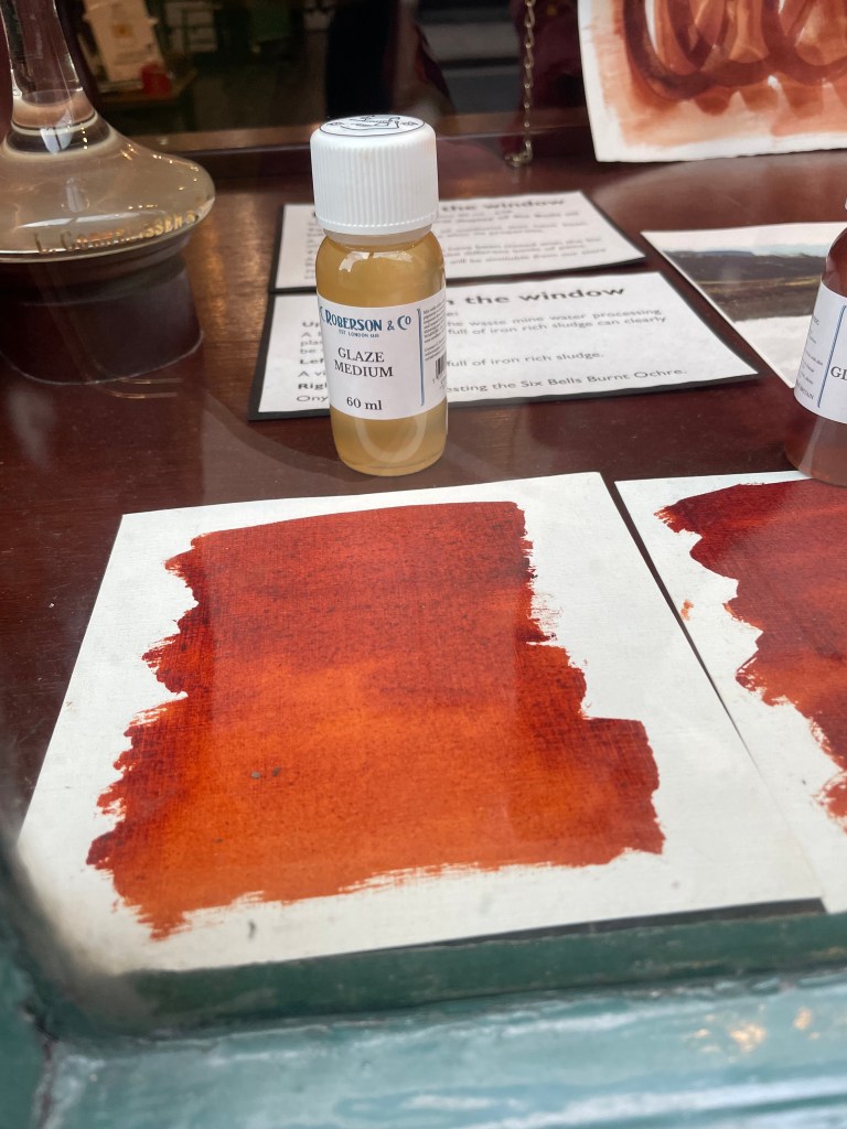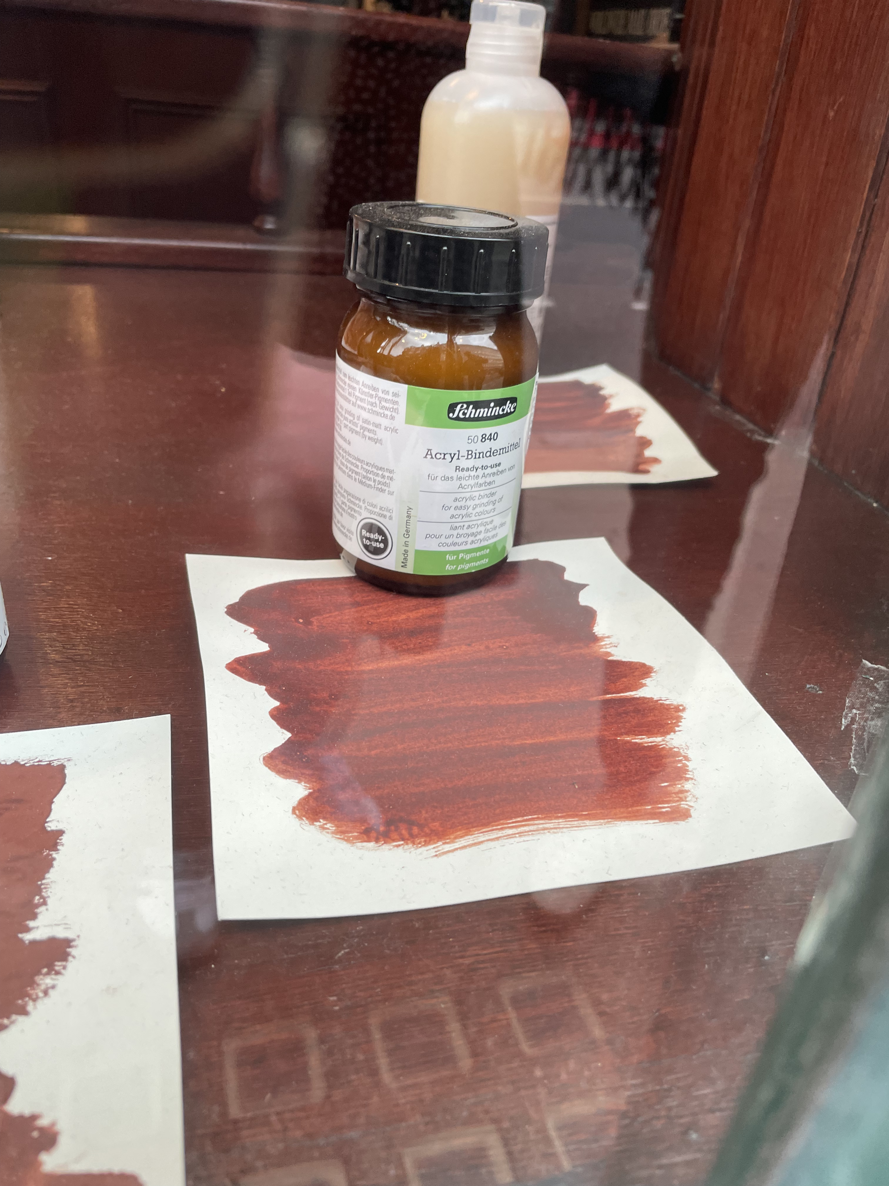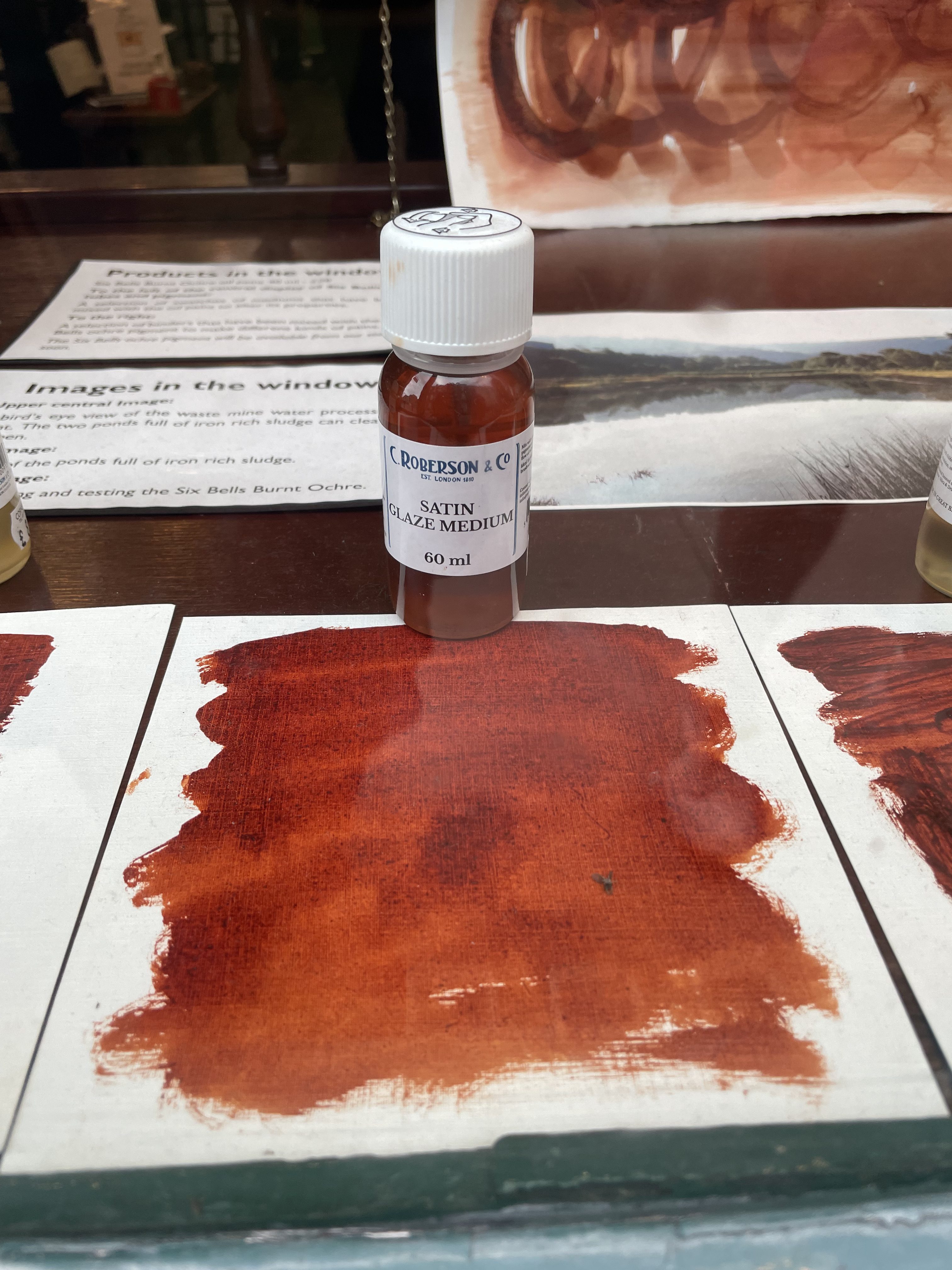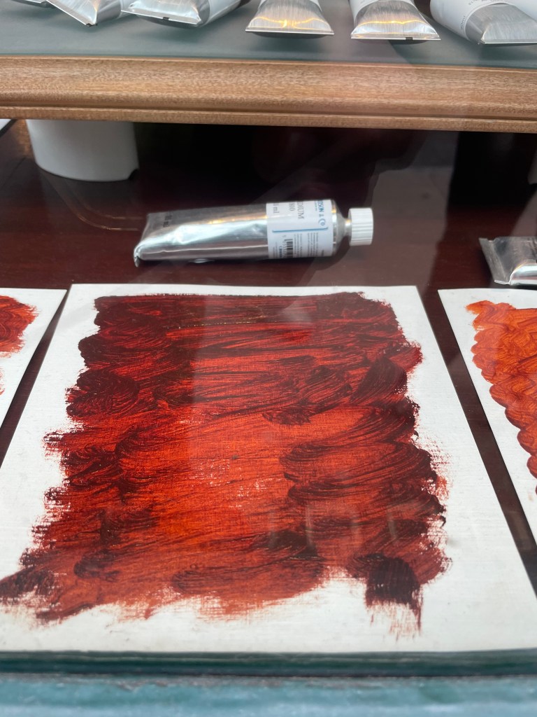 To be fair, I must add that the same pigment in different binders sometimes shifts when the paint dries. Have a look below at how Six Bells Red Ochre performs in virtually all binders imaginable, (and a variety of mediums) and, indeed, there’s a wild difference there (in hue too, it seems, but I’d guess that’s most probably due to its transparency… could also be the density of each sample, of course.