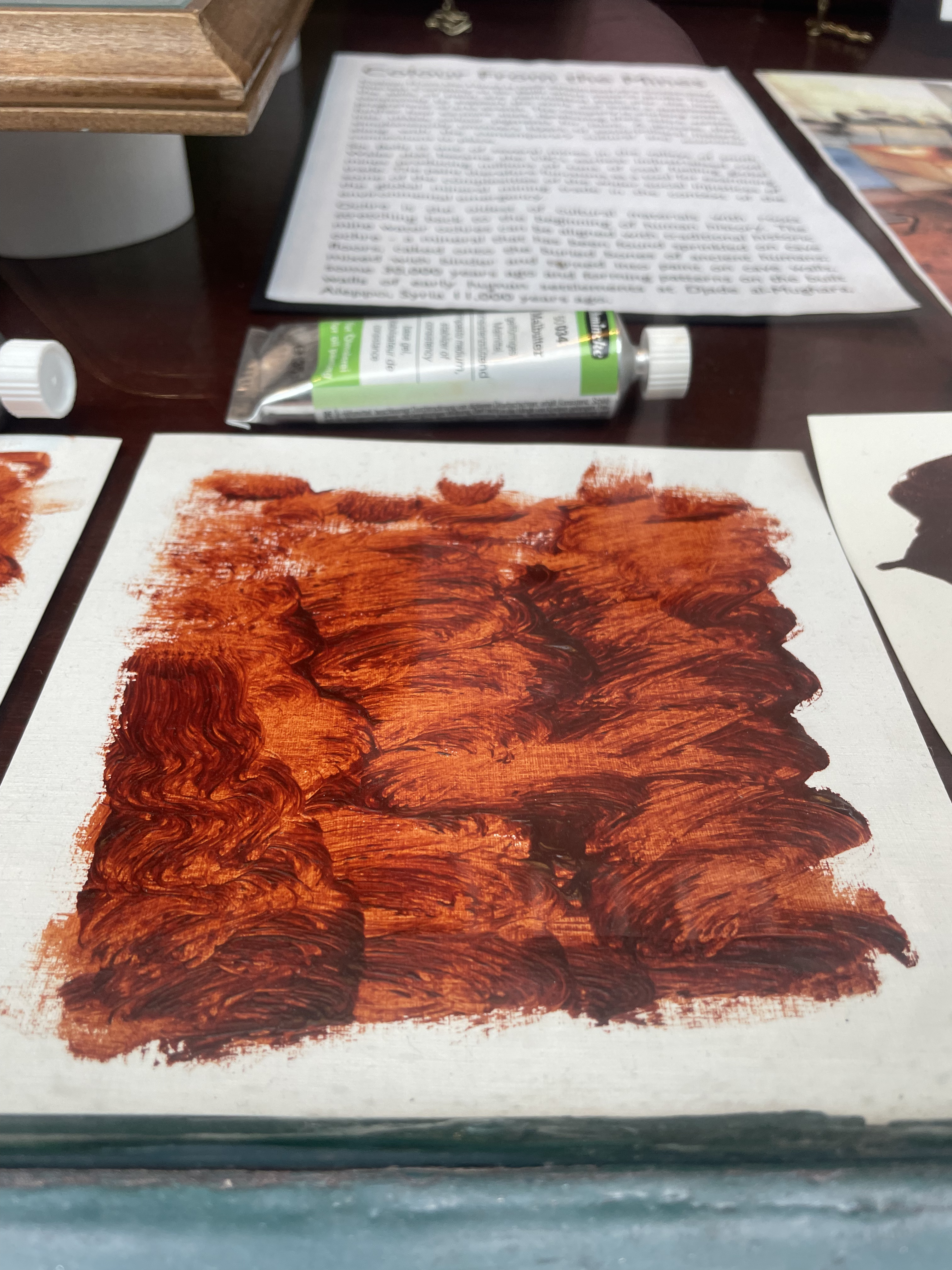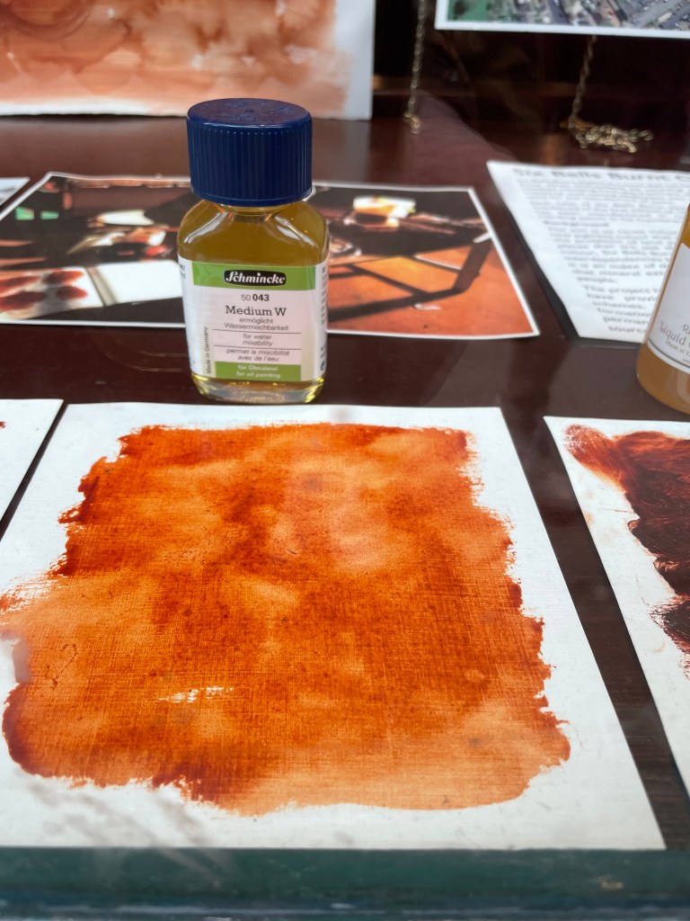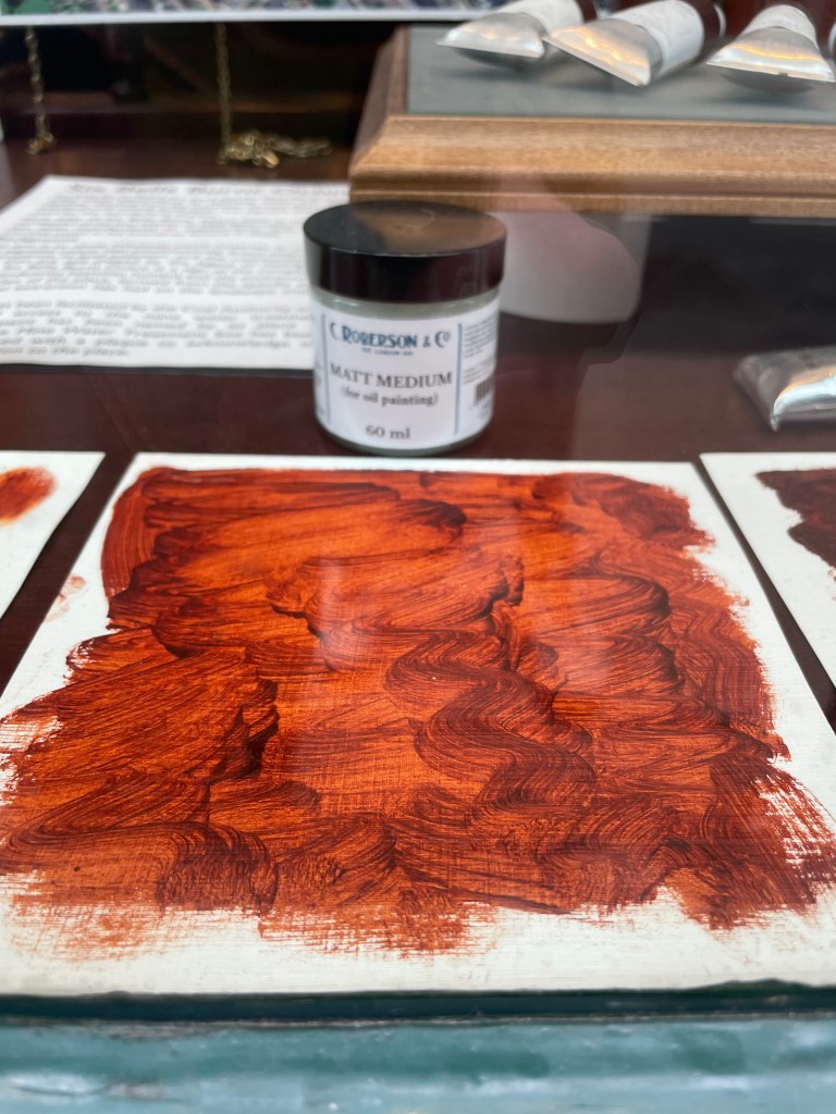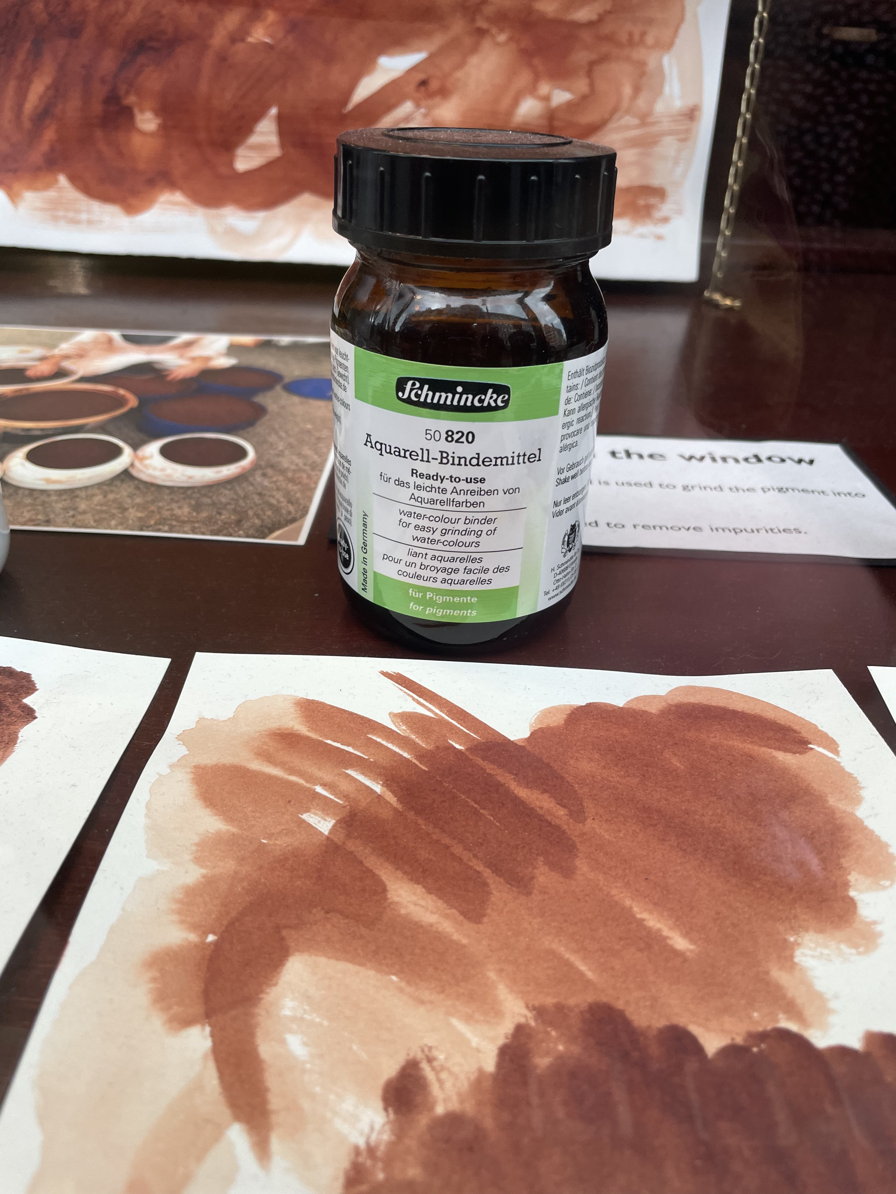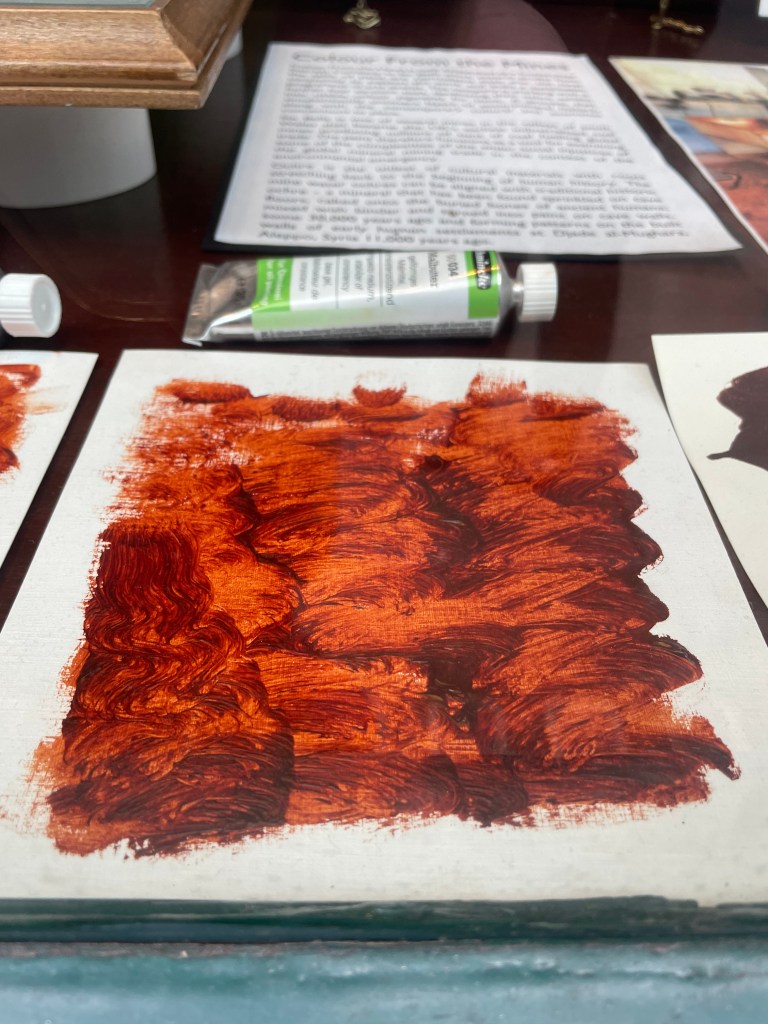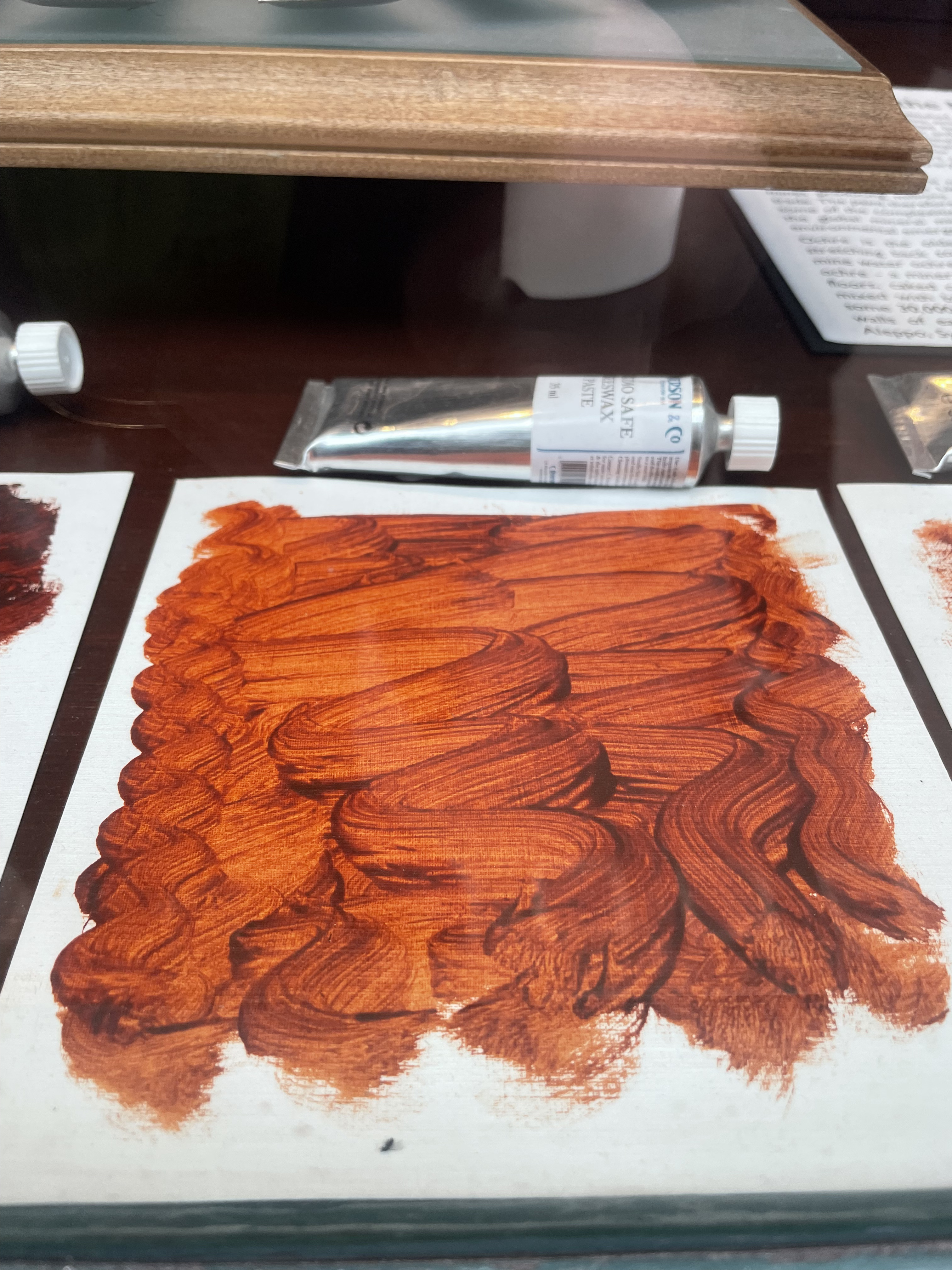 To be fair, I must add that the same pigment in different binders sometimes shifts when the paint dries. Have a look below at how Six Bells Red Ochre performs in virtually all binders imaginable, (and a variety of mediums) and, indeed, there’s a wild difference there (in hue too, it seems, but I’d guess that’s most probably due to its transparency… could also be the density of each sample, of course.