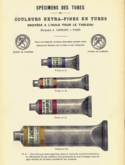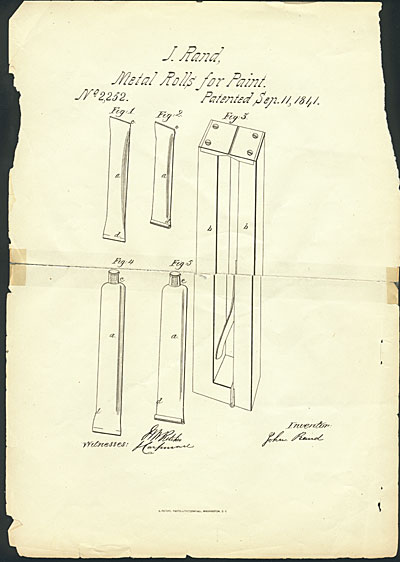 We owe the above description, and the invention of the mighty collapsible tube, to John Rand, an American painter—even if a few adjustments were subsequently made to this initial 1841 patent which consisted of a mere hollow tin cylinder crimped on both ends. The idea came to him from his frustration at learning from his tutor nothing else, it seemed, than how to mull pigments in oils.