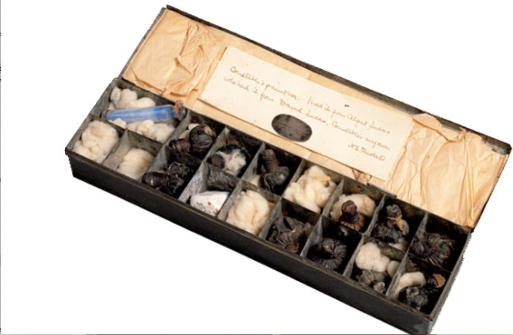 Constable’s metal paint box containing eleven paint bladders, a piece of white stone and a glass phial of blue pigment, c.1837. Estate of Sir Edwin A.G. Manton, Tate Britain, London, UK