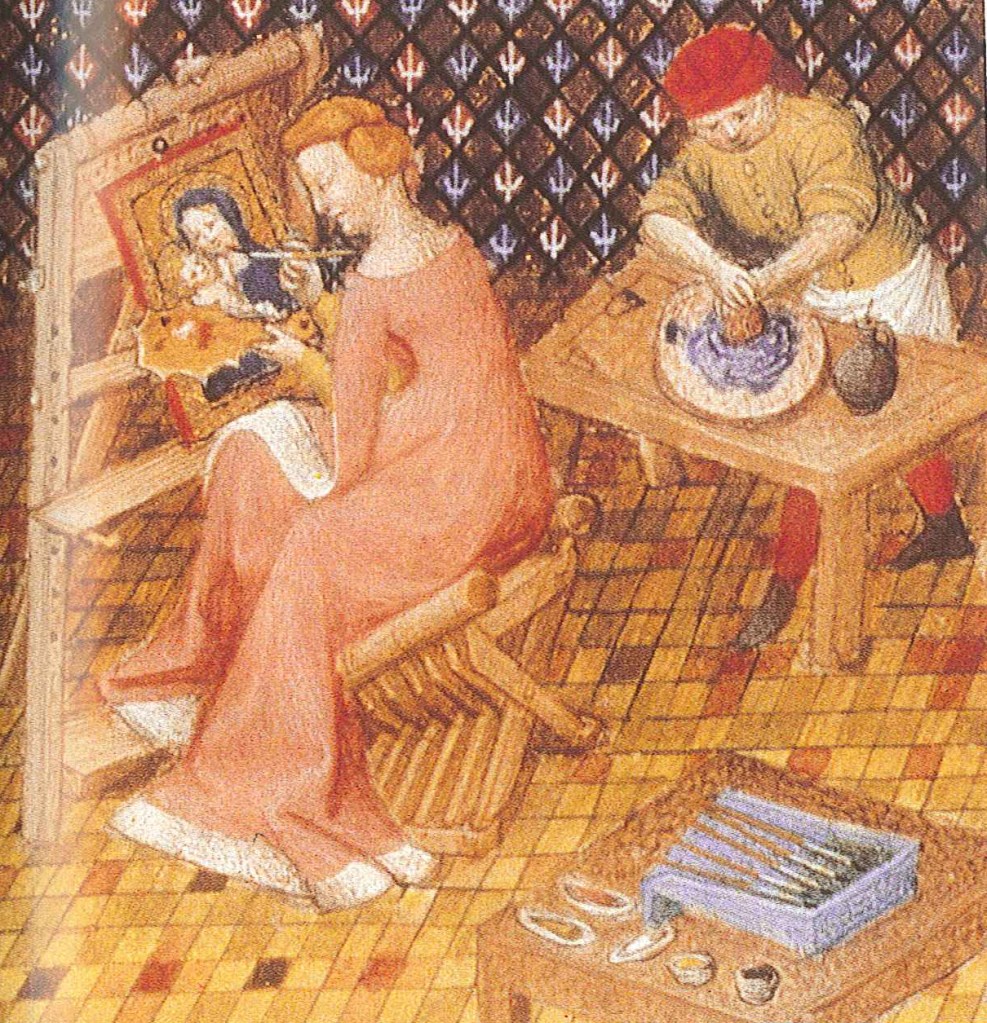 This being said, what has much more importantly and per forza vanished is the mystical contact with the ‘pure’ colour of pigments which gave artists not only a reverence for the process and an appreciation of its complexity but also a direct contact with the energy and beauty of the raw hues. This hands-on approach no doubt opened the subtle possibilities pigment grinding could offer in terms of shades. While each stage of the painting and the artist’s personal preferences allowed specific adjustments to be made to the paint texture in the mulling stage, rendering mediums and solvents sold today virtually unnecessary.