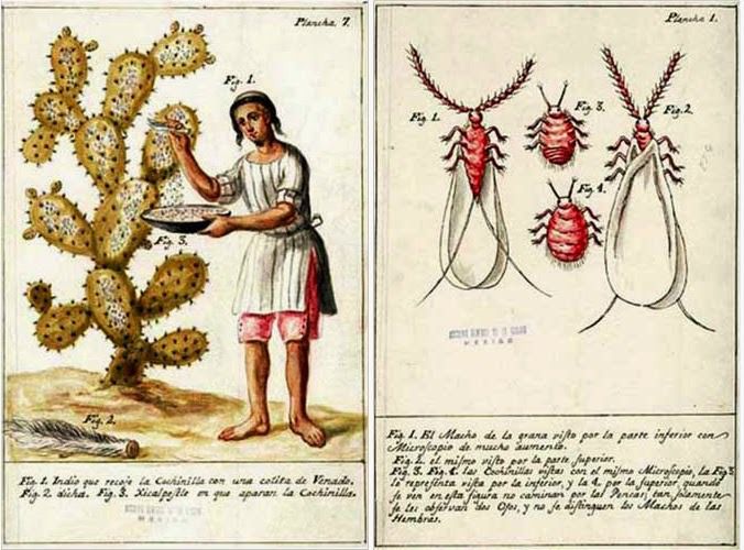 The Spaniards were quick to demand that taxes be paid in that ‘red blood’ and, while it took some seventy thousand insects to make a pound of dye (despite 20% of cochineal’s body mass being dye!) it soon became their most lucrative spoil, second only to silver. By the time it reached the shores of the Old World, however, the origins of the “little worm” were all but lost (perhaps intentionally to guard their lucrative spoil from too much scrutiny and possible competition), and the cochineal louse turned into a seed for centuries under the name of grana. A fact some questioned, yet it apparently took the invention of the microscope, enabling the curious to see the little legs of the beastie, to settle that controversy and for it to be returned definitely to the animal kingdom.1